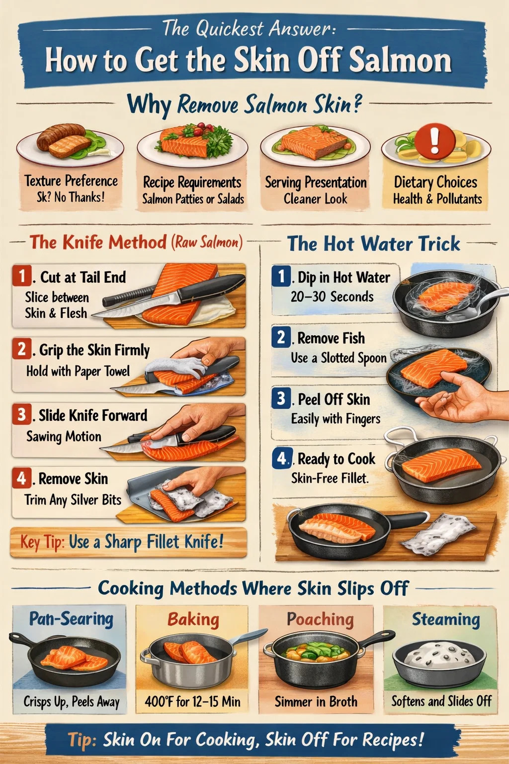 บางครั้งวิธีที่ง่ายที่สุดในการเอาหนังปลาแซลมอนออกคือการปรุงปลาก่อน เทคนิคการทำอาหารบางอย่างทำให้ผิวหลุดออกอย่างหมดจดจนแทบจะหลุดออกจากเนื้อปลาโดยไม่ต้องออกแรงใดๆ