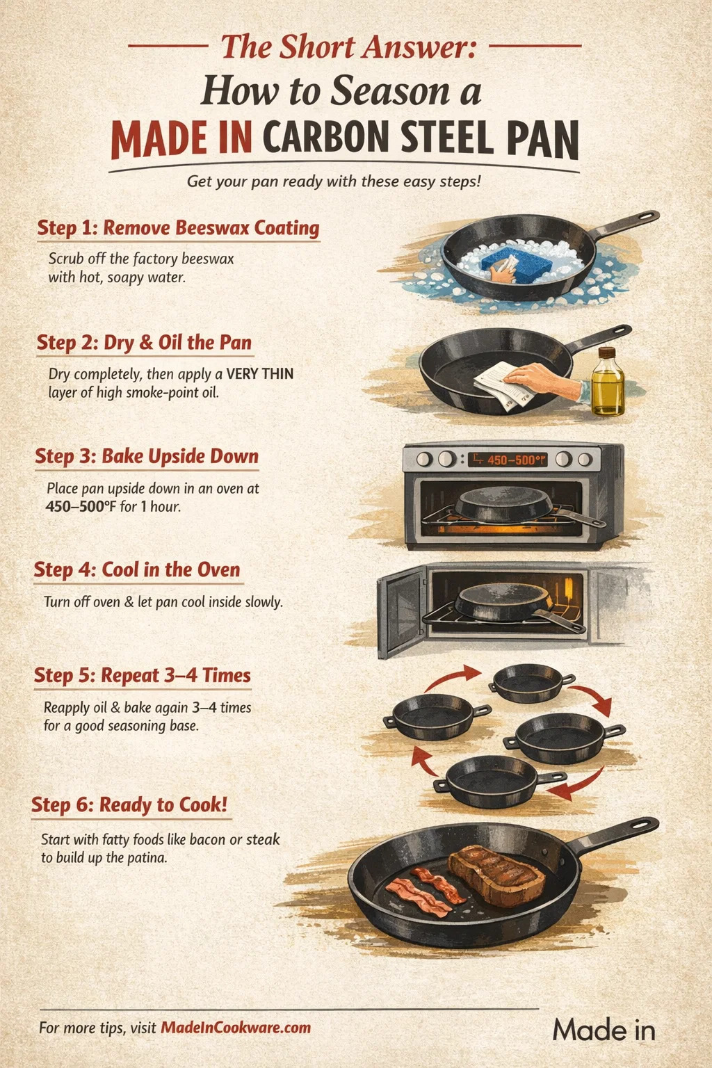 แนะนำให้ใช้วิธีเตาอบในการปรุงรสเบื้องต้นของกระทะเหล็กคาร์บอน Made In เนื่องจากจะให้ความร้อนทั่วทั้งพื้นผิว รวมถึงด้านข้างและด้านนอกอย่างเท่าเทียมกันและสม่ำเสมอ นี่คือกระบวนการโดยละเอียด: