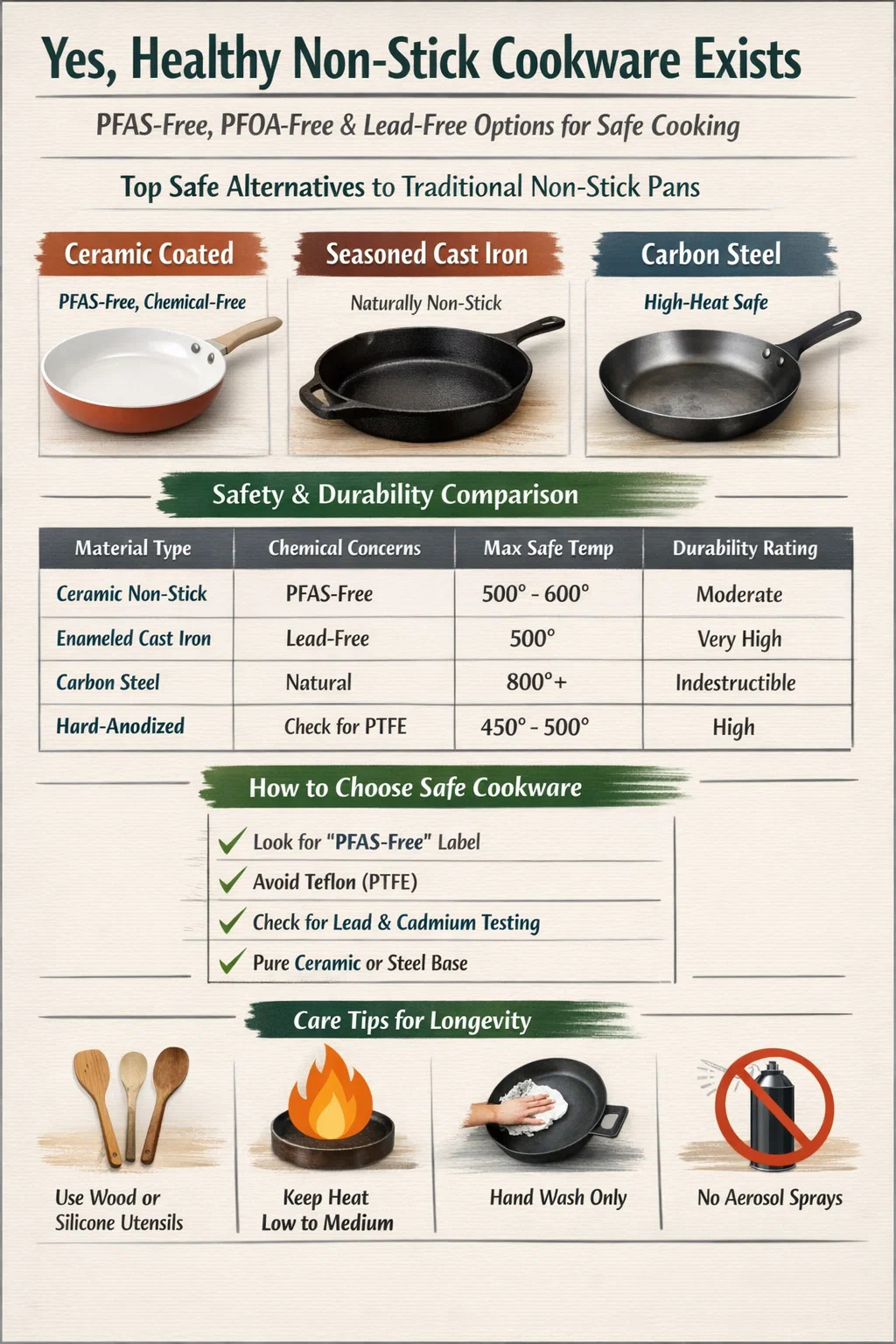 เมื่อเลิกใช้สารเคลือบสังเคราะห์ วัสดุหลายชนิดจะโดดเด่นในเรื่องความปลอดภัยและประสิทธิภาพ วัสดุเหล่านี้จะไม่ชะล้าง "สารเคมีถาวร" ลงในอาหารของคุณ แม้ว่าพื้นผิวจะร้อนเกินไปโดยไม่ได้ตั้งใจก็ตาม