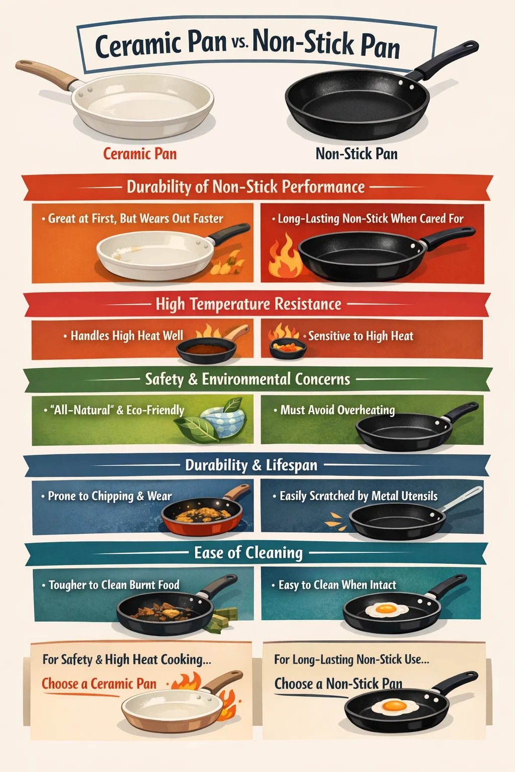 หากคุณกังวลอย่างมากเกี่ยวกับส่วนผสมในการเคลือบ หรือจำเป็นต้องปรุงอาหารที่อุณหภูมิสูงเป็นครั้งคราว และไม่ต้องเปลี่ยนเครื่องครัวทุกๆ หกเดือน เครื่องครัวเซรามิกที่มีความสวยงามมากกว่านั้นก็เป็นตัวเลือกที่ดีกว่า